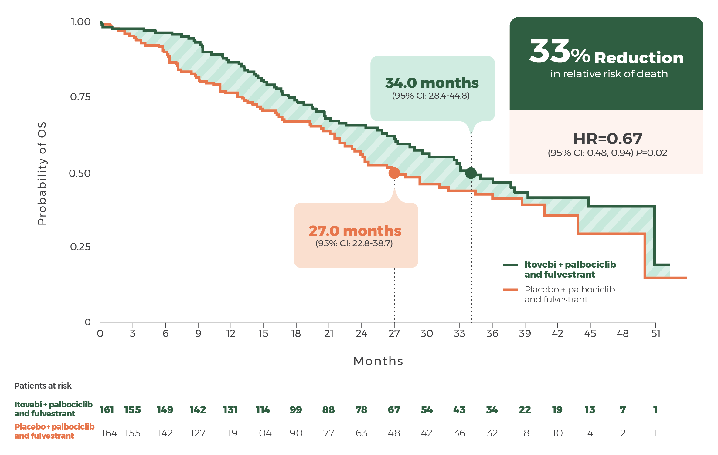 Study design: INAVO120 was a phase 3, randomized, double-blind, placebo-controlled study evaluating the efficacy and safety of Itovebi in combination with palbociclib and fulvestrant in adult patients with endocrine-resistant, PIK3CA-mutated, HR+/HER2- locally advanced or metastatic breast cancer whose disease progressed during or within 12 months of completing adjuvant endocrine therapy and who have not received prior systemic therapy for locally advanced or metastatic disease. The primary endpoint was investigator-assessed PFS per RECIST version 1.1. Secondary endpoints included OS and investigator-assessed ORR and DOR.1